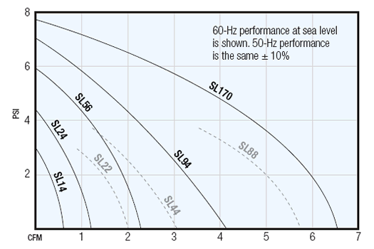 performance; deduct 4% of volume and pressure for every 1,000' (300 m) above sea level. The 3,450-rpm motors used on these regenerative