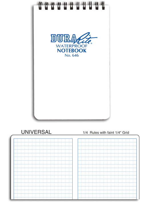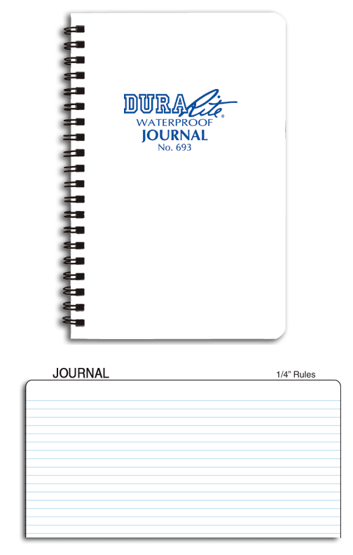 DuraRite paper with white Polydura covers. 32 sheets (64) pages, ruled with light